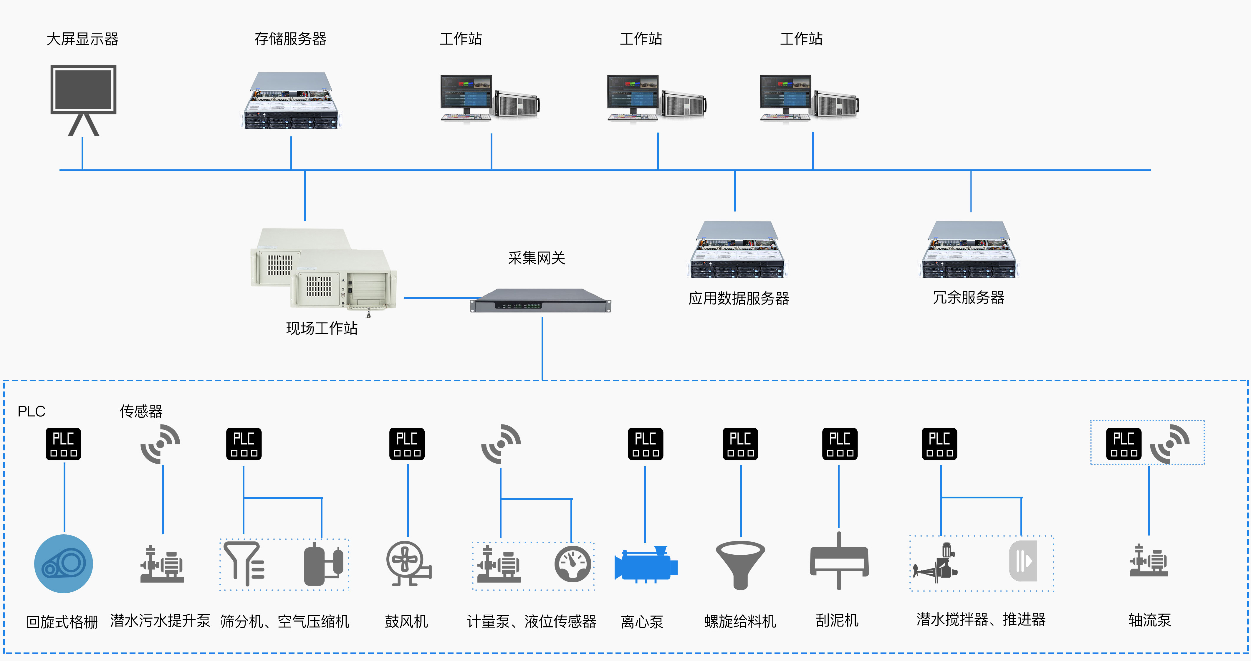 污水處理系統運行于污水處理廠中控室的計算機中,主要分為儲存服務器,數據處理服務器,冗余服務器,還有操作員用的工作站(現場操作的工作站,后臺的監督工作站),軟件配合計算機將所有工藝環節數據與控制數據進行采集,計算機上使用形象立體畫面表現水廠工藝流程及各種數據,并對水廠進行相應的控制,同時實現對各種數據的分析處理。對污水廠提高運行效率,降低運營成本、提高管理水平起著至關重要的作用。